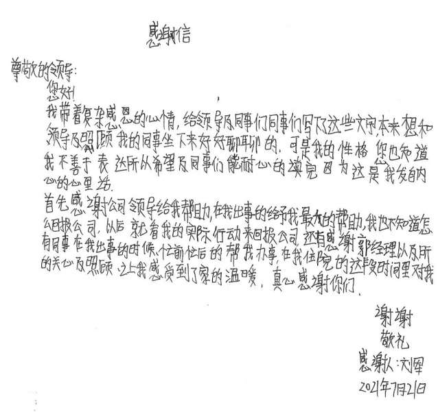 经过半个月治疗休养,刘军手部已无大碍。出院后的他写了一封感谢信并为公司送了一面锦旗,他说道,是MK官方网页版-MK(中国)这个大家庭让他感受到了关怀和温暖,他表示要把这种关怀变成工作上的动力,争取早日返回工作岗位,努力工作,回报大家的关心和关爱。